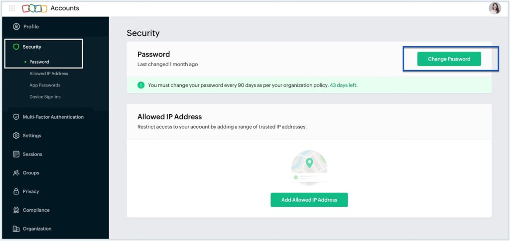Men hvis du planlægger at bruge funktioner som POP/IMAP, Active Sync eller e-mailvideresendelse, skal du generere og bruge en specifik Zoho-adgangskode, selvom du har oprettet kontoen via federeret login. Dette kan gøres via accounts.zoho.com, hvor du kan administrere dine sikkerhedsindstillinger og generere en app-specifik adgangskode, hvis nødvendigt.